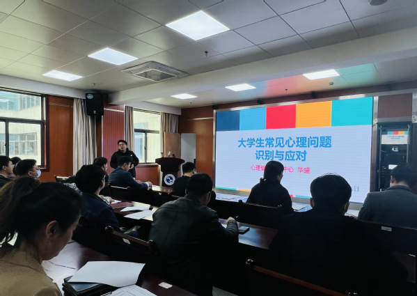 会上,华盛从学生常见的心理问题作为切入点,结合了我院学生的实际情况,重点讲解了常见心理问题的识别和需要重点关注的学生群体,以及相应的援助策略。