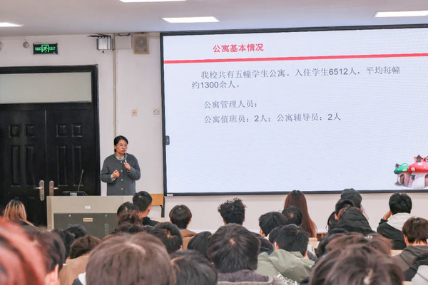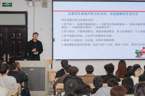 随后,院辅导员何韧之老师对宿舍物品摆放、卫生死角清理、以及宿舍内吸烟酗酒、熄灯作息问题进行强调。第一,针对使用大功率电器、私拉电线等问题进行重点强调,叮嘱寝室长一定要监督提醒宿舍成员,养成人走断电的好习惯。第二,着重强调宿舍长是宿舍内部管理的责任人,是宿舍文明建设的核心,全面负责本宿舍的安全卫生、作息就寝等事情,对于调解宿舍成员关系、化解宿舍矛盾、报告突发事件、日常报修、防范电信诈骗等方面,宿舍长要积极发挥作用。第三,强调寝室长在宿舍环境氛围建设方面积极引导,围绕净化宿舍、美化宿舍和制度建设等方面,努力将宿舍打造成整洁温暖的休息场所,促使宿舍成员共同营造和谐文明、健康向上的宿舍氛围。