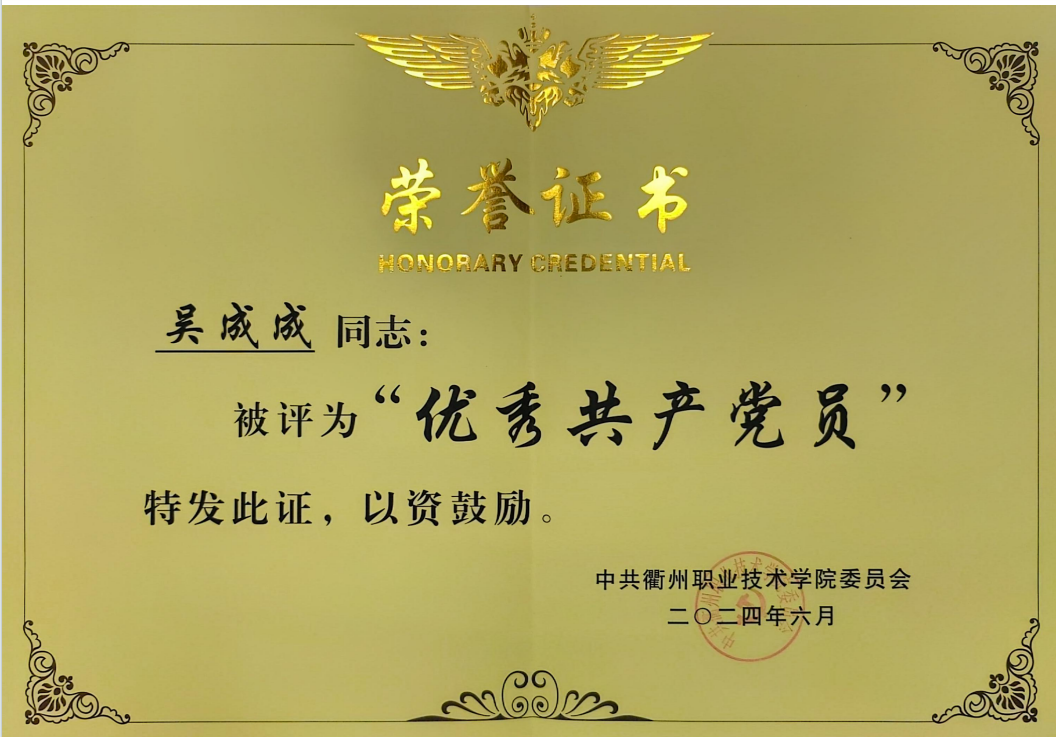 近日,支部党员教师吴成成同志荣膺校级“优秀共产党员”称号。吴成成老师在教科办岗位上,恪守党员本分,充分发挥了先锋带头作用,于教学辅导、科研推进及党员服务中业绩显著。此荣誉不仅是对其个人付出与成就的嘉奖,更成为激励支部同仁共同努力的新动力。