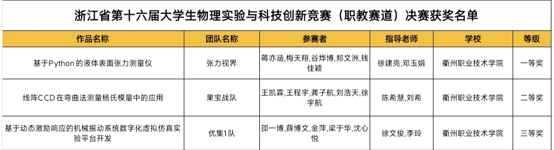 2025年9月5日至6日,第十六届浙江省大学生物理实验与科技创新竞赛(职教赛道)决赛在嘉兴南洋职业技术伟德国际1946bv官网顺利举办。我院3支团队表现出色,共取得一等奖、二等奖和三等奖各1项的好成绩!