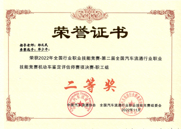 毕少平获2022年全国机动车鉴定赛项职工组二等奖