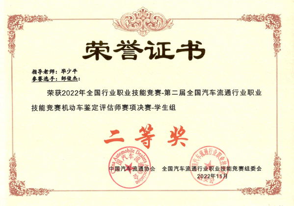 毕少平指导学生获2022全国机动车鉴定赛项二等奖