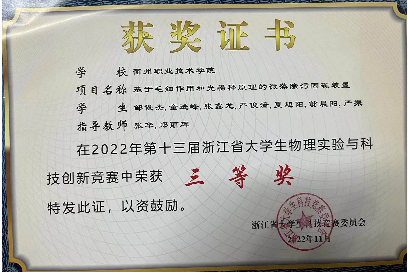 张华、郑丽辉指导学生获2022年第十三届浙江省大学生物理竞赛三等奖