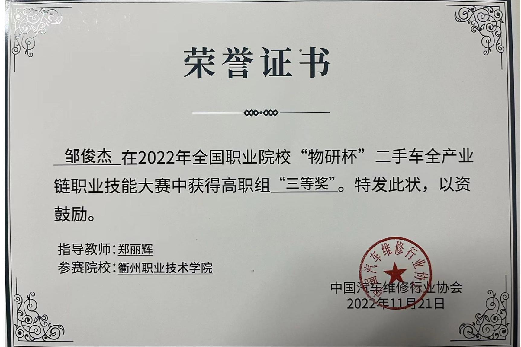 郑丽辉指导学生获全国职业院校“物研杯”二手车全产业链职业技能大赛高职组三等奖