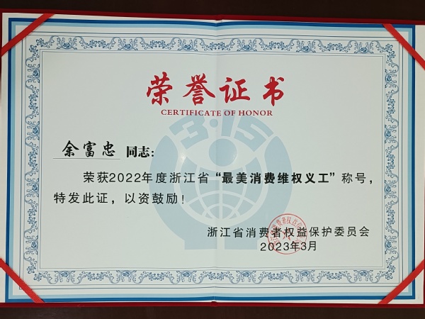 余富忠被评为2022年度浙江省“最美消费维权义工”