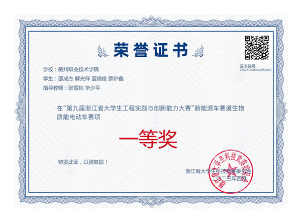 张雪钊、毕少平指导学生获2023年浙江省大学生实践与创新能力大赛新能源车赛道一等奖