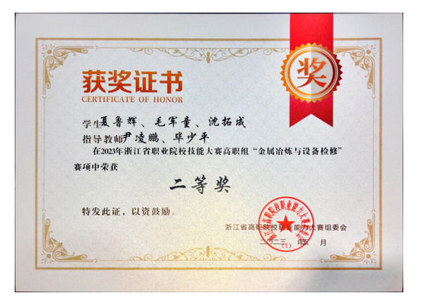 毕少平指导学生获2023年浙江省高职学生技能大赛金属冶炼与设备检修项目二等奖