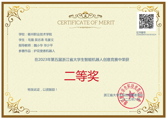 魏小华、毕少平指导学生获2023浙江省智能机器人创意赛二等奖